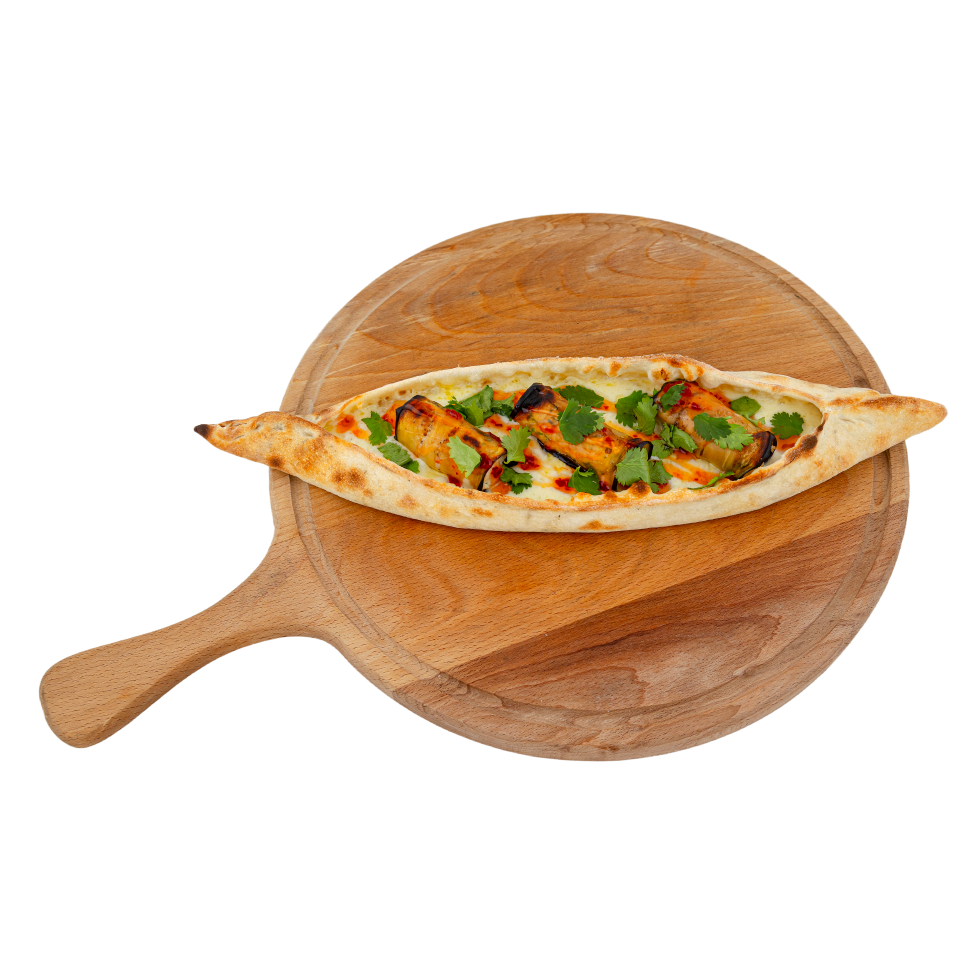 Тесто( мука, дрожжи, соль, сахар, вода, масло оливковое), моцарелла, баклажан, твороженный сыр, грецкий орех, чеснок, кинза, соус сладкий чили.