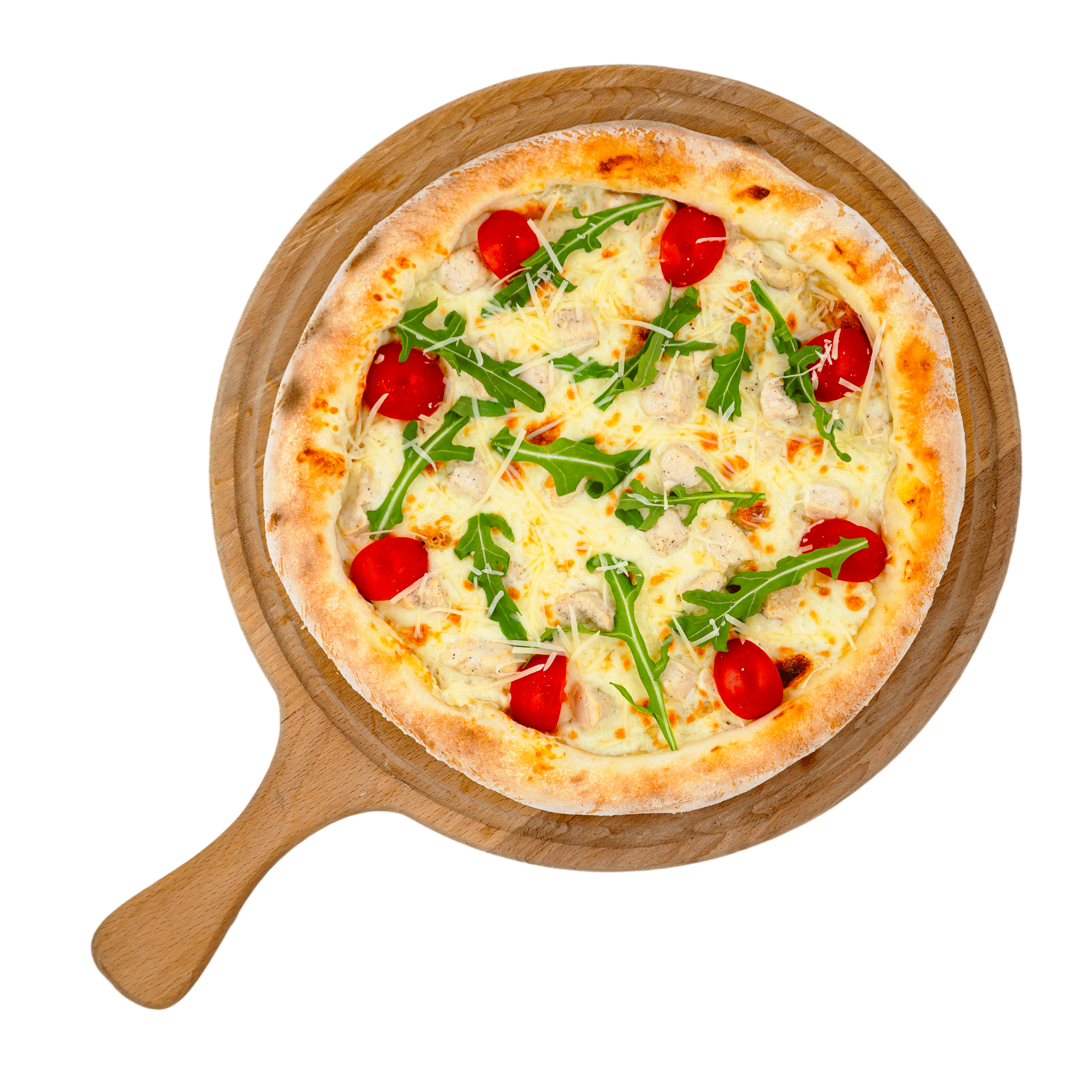 Тесто (мука, дрожжий, соль, сахар, вода, масло оливковое), соус цезарь (майонез, анчоусы, каперсы, хрен, горчица), моцарелла, курица, черри, пармезан, рукола.