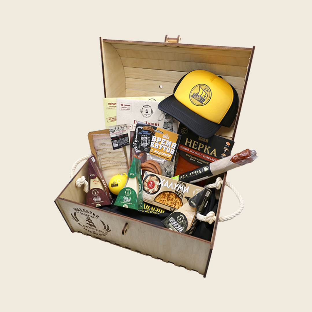 Что взять на память от холдинга «Афанасий»? Ведь у нас есть столько всего: от ароматного пенного и полезных ремесленных продуктов до увлекательных экскурсий! Не так-то просто выбрать! Мы придумали решение и собрали целый сундучок, куда поместили всё, что олицетворяет нас: изысканные сыры, пикантные карпаччо и колбасы, закуски из рыбы, а также безалкогольное пиво. А ещё мы вложили туда наш стильный фирменный мерч: спортивную бейсболку, дождевик и клёвую спортивную сумку, куда поместится всё необходимое.