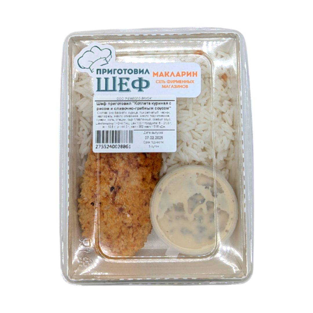 Шеф приготовил «Котлета куриная с рисом и сливочно-грибным соусом» 75/140/40 гр.