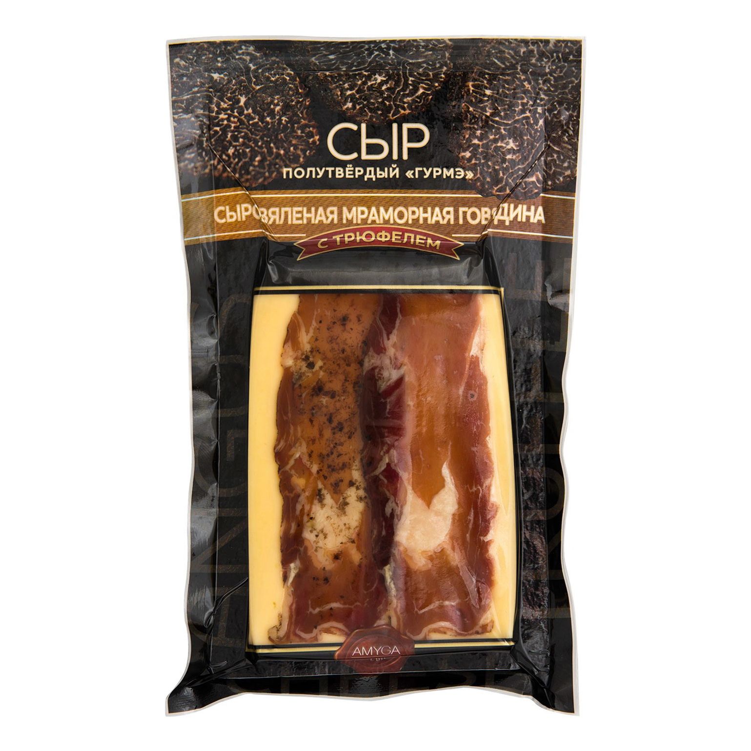 Сыр «Гурмэ» с сыровяленой мраморной говядиной и трюфелем – это полутвёрдый сыр с оригинальным топингом сверху. Сыровяленое мясо, нарезанное тончайшими ломтиками, дополняет сливочный вкус сыра пикантными дымными нотками, а трюфель превращает продукт в роскошный деликатес. Традиционно такие сыры подают к дижестиву, аперитиву или в качестве лёгкой закуски к красному вину.